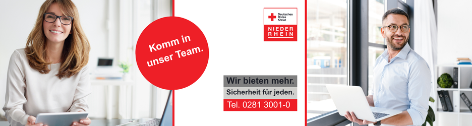 Gestalten Sie mit uns die Zukunft – wir freuen uns auf Sie! Wir sind das Deutsche Rote Kreuz - Kreisverband Niederrhein e.V. – einer der größten Wohlfahrtsverbände im Kreis Wesel. Mit über 500 engagierten Mitarbeitenden setzen wir uns tagtäglich für das Wohl der Menschen in unserer Region ein. Unser breites Spektrum an Aufgaben reicht vom Rettungs- und Sanitätsdienst über vielfältige Pflegeangebote und soziale Dienste bis hin zum Katastrophenschutz. Auch in der Kinder- und Jugendarbeit übernehmen wir Verantwortung und gestalten Zukunft aktiv mit.